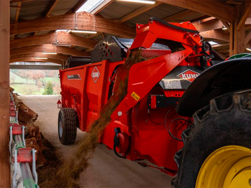 Equipada com um rotor de grande diâmetro, acionado pelo sistema exclusivo POLYDRIVE (correia desacoplável hidraulicamente), esta máquina garante uma distribuição fluida e contínua, mesmo com forragens de fibra longa, como feno ou erva enfardada. A sua rampa hidráulica com pentes reguladores permite ajustar o nível de agressividade do desfibrador conforme o tipo de material.