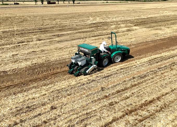 Posteriormente, o trator CVT autónomo LOVOL P2404-7V operou a plantadeira de precisão com acionamento elétrico para realizar o plantio direto de milho diretamente em campos de restolho de trigo. Este sistema alcançou uma melhoria de 50% na eficiência, mantendo a profundidade de semeadura ideal e a precisão do espaçamento, proporcionando um plantio direto com verdadeira precisão.