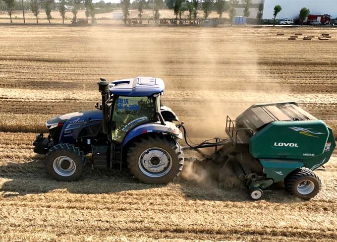 O trator com mudança de potência da LOVOL demonstrou uma sincronização perfeita com implementos inteligentes durante a demonstração ao vivo do fluxo de trabalho totalmente automatizado de «colheita-enfardamento-plantio». Na operação autónoma de enfardamento, o trator com mudança de potência da LOVOL puxou a enfardadeira redonda da LOVOL para compactar a palha de trigo em fardos cilíndricos padronizados com precisão.